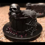 - Assembly: Place one layer of the cooled cake on a plate. Spread a layer of blackberry compote on top, then add a layer of black cocoa frosting. Place the second cake layer on top and frost the entire cake. Decorate with chocolate skulls, fresh blackberries, and dried rose petals for a spooky touch!