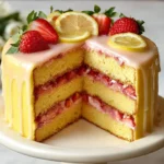 Delicious strawberry lemonade layer cake with fresh strawberries and lemon icing