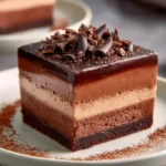 This cake is a soft chocolate base topped with three smooth mousses — dark, milk, and white chocolate. It looks fancy but is simple to make. You can make it for a birthday, a special dinner, or when you just want a big chocolate treat. If you enjoy layered chocolate desserts, you might also like this chocolate mousse cake.